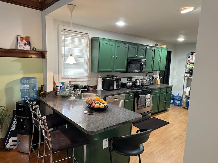 Es una instalación muy agradable y compartida ubicada en una calle tranquila. Está cerca de la ciudad de Nueva York a 25 minutos en el autobús 114/113, el aeropuerto de Newark a 10 minutos y muchos restaurantes y tiendas. El espacio está muy bien decorado con una zona de trabajo y los huéspedes tienen acceso a una cocina completa con lavandería. Tienes acceso a un wifi y televisión por cable súper rápidos con Netflix, Hulu y YouTube. La casa tiene aire acondicionado central y estacionamiento en la calle libre o en la entrada.