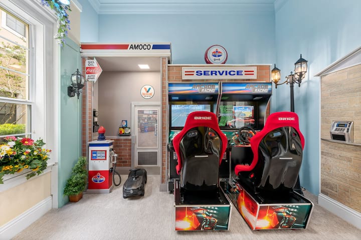 Tan pronto como entras en esta casa de lujo, te recibe el gran comedor abierto que fluye hacia la cocina y el salón. Justo al entrar por la puerta principal, la emoción de la sala de juegos para niños, única en su clase, atraerá la atención de los más pequeños. Las puertas de doble entrada se abren a un mundo de maravillas, ¡y los más pequeños entran en su propio centro de la ciudad! El centro de la ciudad viene con todo lo que esperarías, incluyendo una estación de bomberos, una estación de servicio, un cajero automático, una oficina de correos (con buzón) e incluso una cárcel. La cárcel viene equipada con una celda y una cama con un lavabo y un inodoro falsos. Los visitantes se sentirán bien sabiendo que pueden mantenerse en contacto en la sala de visitas de al lado con cristal bidireccional y teléfono para charlar con los que están en problemas. Una vez que se liberen, disfrutarán de horas de diversión en el tobogán extra de remolino de caída y en el juego de carreras arcade comercial personalizado, con todos tus juegos de carreras favoritos.