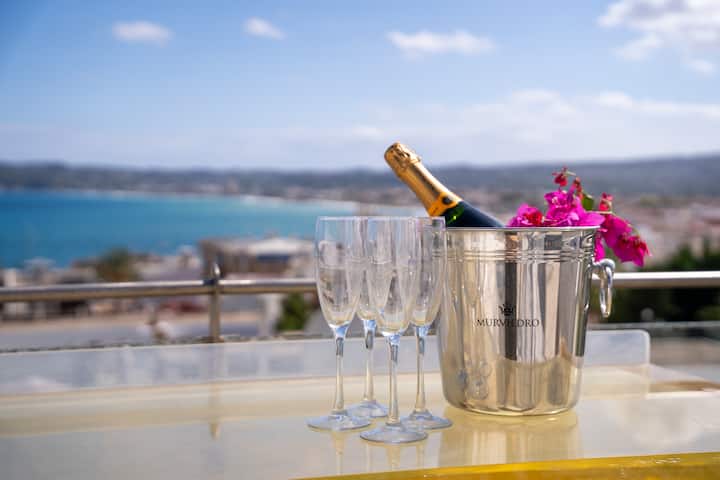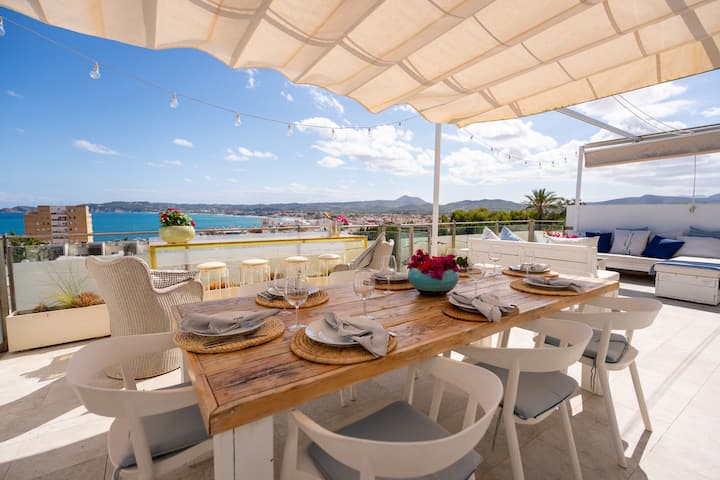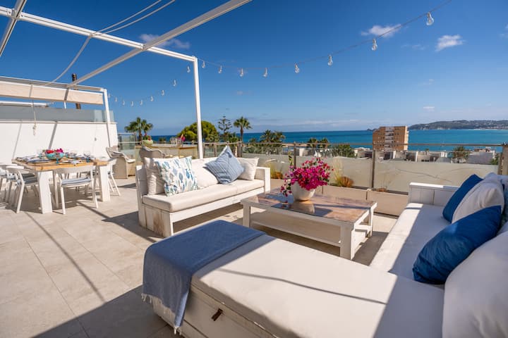 - Gran terraza en la azotea con vistas al mar, cocina pequeña, comedor, sillas y camas, barbacoa de gas y sala de yoga cubierta.