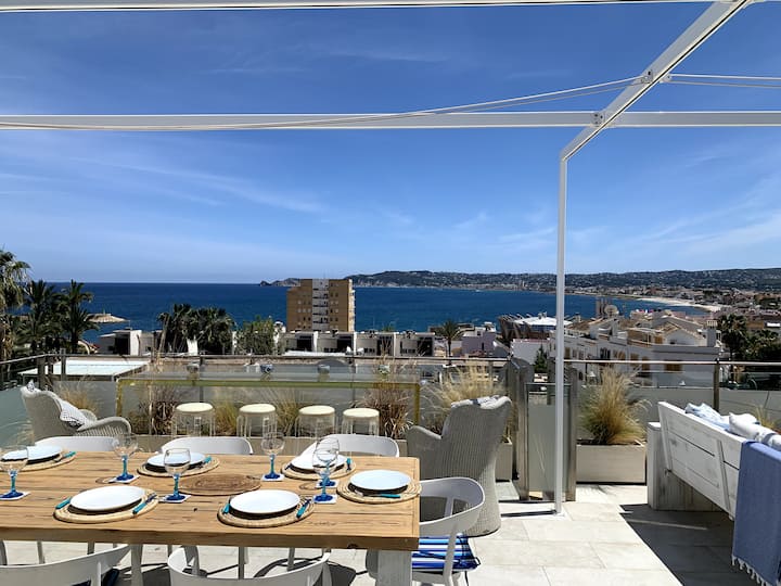 Amplia casa adosada moderna con una increíble terraza en la azotea y vistas al mar con vistas a la bahía de Jávea/Xàbia. La casa tiene una ubicación ideal, a solo 3 minutos a pie de la playa La Grava y de los restaurantes, bares, tiendas y puerto deportivo del puerto pesquero de Jávea/Xàbia. Está a 15 minutos a pie del casco antiguo de Jávea y a 3 km a lo largo del Mediterráneo hasta la Playa de l'Arenal.