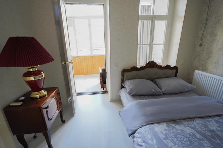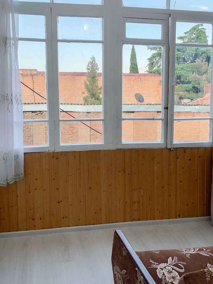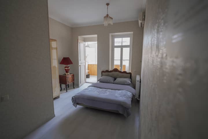 Esta habitación doble privada de 20 m² ofrece un espacio amplio y luminoso para parejas o viajeros solitarios que buscan comodidad y privacidad en el corazón del casco antiguo de Tiflis. La habitación está situada en la entreplanta entre la segunda y la tercera planta de la casa de huéspedes, lo que proporciona un refugio tranquilo.
