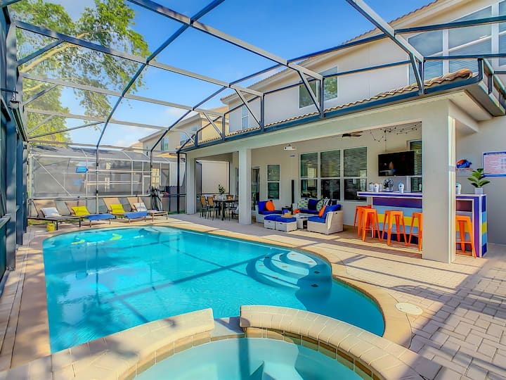 Lo más destacado del alojamiento: Star Wars temática (con Storm Trooper de tamaño natural) Sala de juegos con aire acondicionado - Sala de juegos para adultos - Cocina completa moderna con encimeras de granito y electrodomésticos de acero inoxidable - Barra de café - Dormitorios temáticos para niños/adolescentes - Piscina/spa privada climatizada orientada al sur (la calefacción cuesta $ adicionales) - ¡Cine y bar junto a la piscina!