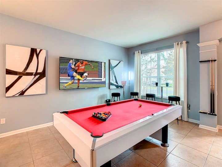 Entretenimiento en casa: increíble sala de juegos con aire acondicionado donde puedes jugar al baloncesto, hockey de aire, futbolín, tejo y videojuegos de Xbox - Área para adultos con mesa de billar y TV de pantalla plana de 75 pulgadas - Televisores inteligentes en todos los dormitorios - Cine junto a la piscina - Wifi GRATUITO
