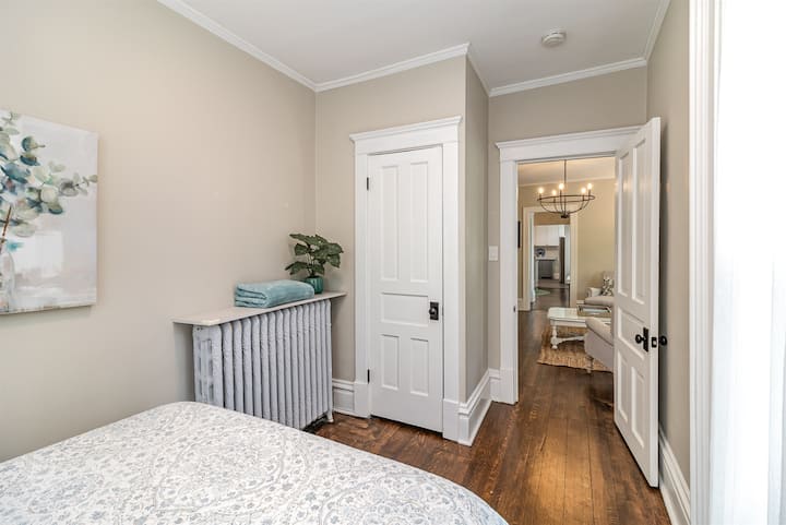 Las unidades están dentro de una casa histórica que alberga a otros dos inquilinos de larga duración. Después de entrar en un vestíbulo compartido y subir por escaleras curvas, los huéspedes tienen sus propios espacios dedicados por completo. La única otra área compartida es la lavadora/secadora del sótano. Los apartamentos en sí (dormitorios, cocina, salas de estar, etc.) son tuyos por completo y no se comparten con nadie fuera de tu grupo. La entrada sin llave permite una llegada autónoma fácil, y serás recibido con un manual de sugerencias para restaurantes locales y actividades divertidas en los alrededores.