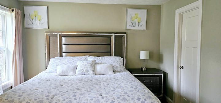 Súper acogedora suite principal con cama tamaño king y jacuzzi.