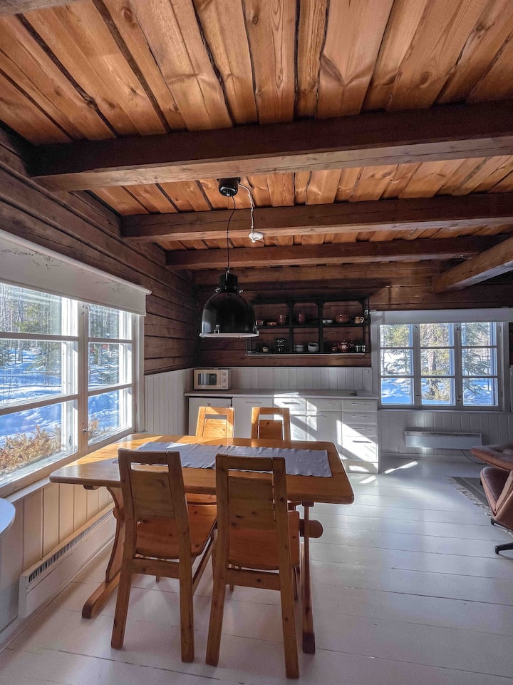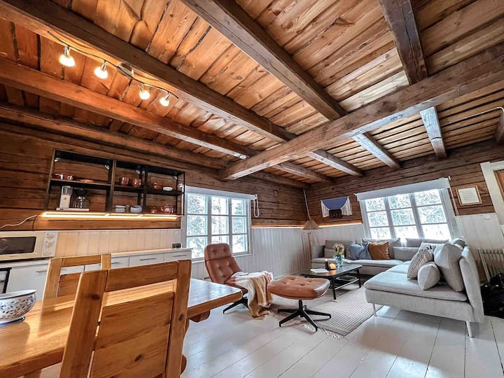 Magnífica cabaña de madera a orillas del río, con la superficie renovada.