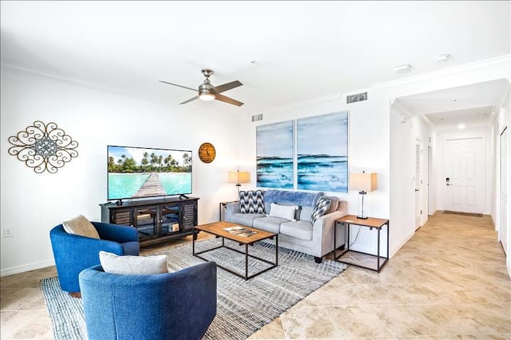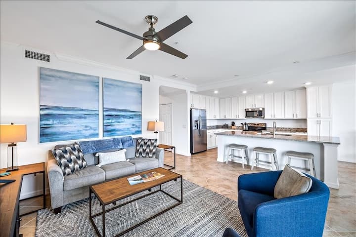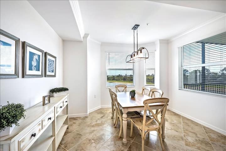 MEMBRESÍA DE SERVICIOS SOCIALES en BABCOCK NATIONAL GOLF & COUNTRY CLUB ALOJAMIENTO EN RESORT DE 1ª CLASE INCLUIDO CON TU ALQUILER (SIN GOLF) Este hermoso condominio de concepto abierto (modelo Birkdale) está en el tercer piso del Babcock National Golf & Country Club. El dormitorio principal tiene una cama tamaño king con 2 vestidores y baño principal contiguo. El dormitorio de invitados tiene una cama queen con armario y su propio baño con lavandería que incluye lavadora y secadora nuevas.