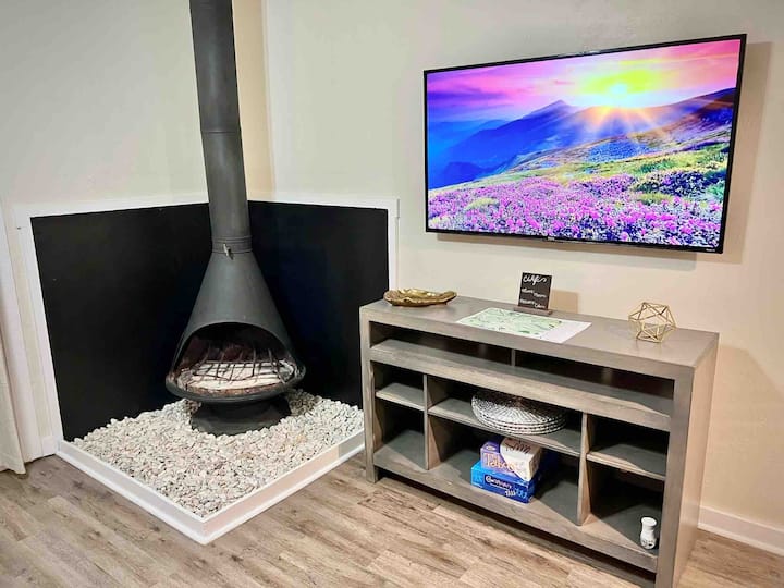 Precioso estilo de cabaña con chimenea interior