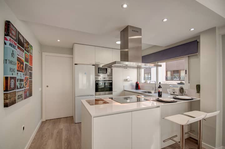 Nada más entrar, a mano derecha, se encuentra una moderna cocina abierta al salón que dispone de todos los electrodomésticos y utensilios necesarios para cocinar. El salón-comedor, rodeado de balcones, disfruta de mucha luz natural y está equipado con un sofá cama (140cm x 190cm), Tv y una mesa de comedor moderna con sitio suficiente para sentarse y comer cómodamente.