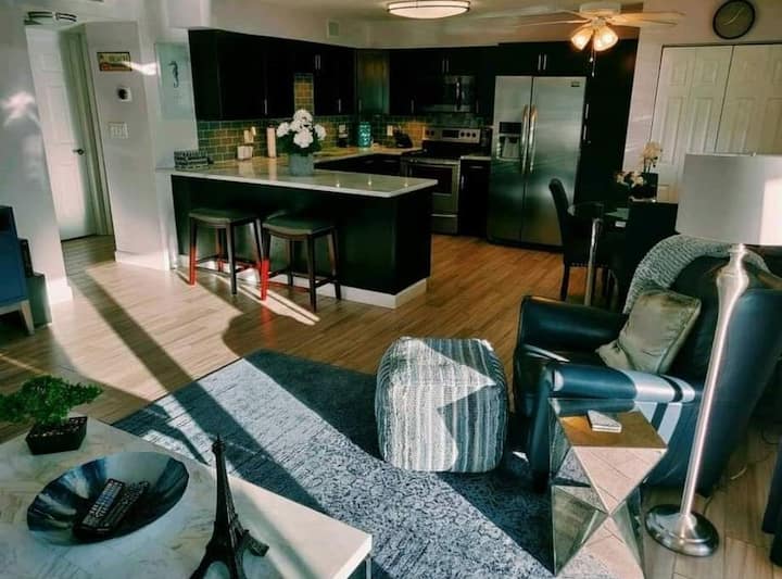 La cocina está totalmente equipada e incluye lavavajillas, máquina de hielo, microondas, triturador de basura, nevera y estufa de convección eléctrica. Encontrarás ollas, sartenes , utensilios y cafetera, así como una freidora de aire.