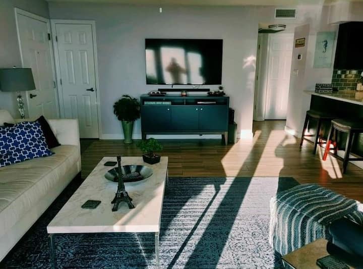 El dormitorio principal tiene una cama tamaño king con colchón de 18 pulgadas con la parte superior acolchada con la parte superior acolchada y un buen armario y un tocador. Para los huéspedes adicionales, hay una cómoda cama tamaño queen en el segundo dormitorio y un escritorio.
