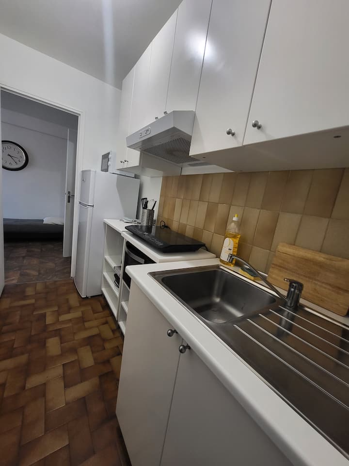 • Cocina independiente: La cocina está equipada para preparar sus comidas y compartir momentos de convivencia. Equipada con horno, placas de cocción, nevera grande, cafetera de filtro, hervidor de agua y microondas. También tendrá toda la vajilla necesaria para 4 personas.