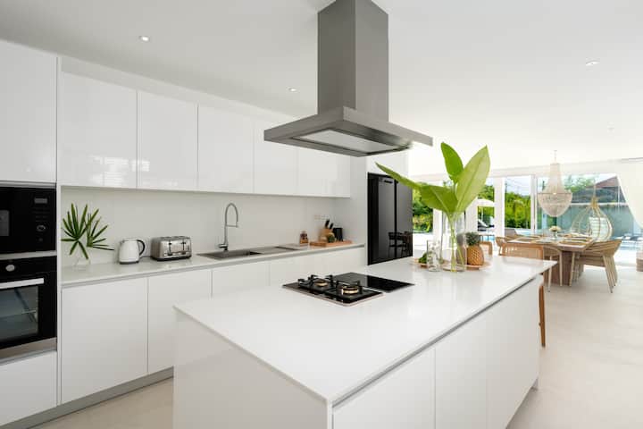 La gran zona interior de planta abierta cuenta con una cocina de estilo occidental con barra de desayuno, nevera grande, cafetera nespresso, placas de gas e inducción, con utensilios de cocina y comedor completos. La cocina y el comedor pueden atender fácilmente a 8 personas, con taburetes adicionales sentados en una barra de desayuno contigua a la cocina. Es una zona interior muy grande, lo suficientemente espaciosa para que todos los huéspedes disfruten del hermoso ambiente que esta villa tiene para ofrecer. También hemos agregado un sistema de filtración de agua limpia a la villa para garantizar que el agua proporcionada sea de mayor calidad que la mayoría de las otras propiedades disponibles.