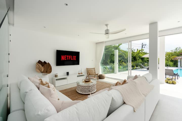 Con la sala de estar que consta de un sofá de primera calidad en forma de L, un gran televisor de pantalla plana de 65 pulgadas se encuentra en la pared, donde los huéspedes pueden disfrutar de cientos de canales internacionales de televisión, deporte, caja y cine a pedido. La villa está amueblada con los más altos estándares, creando el lugar más perfecto para disfrutar de tus vacaciones en Koh Samui.