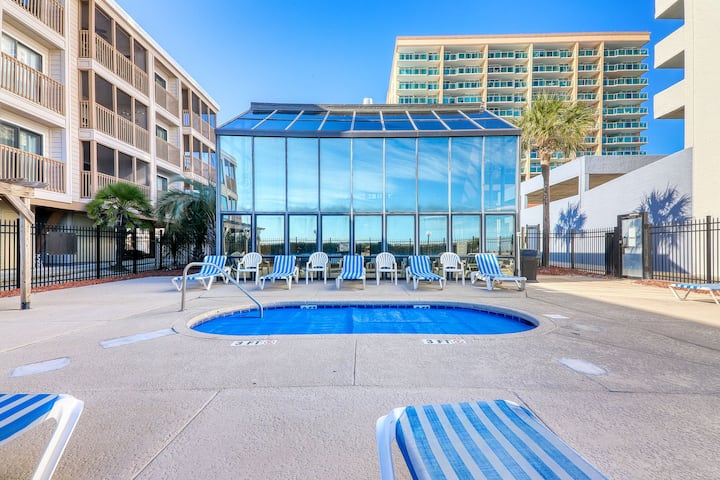Elliott Beach Rentals te da la bienvenida a San A Bel 411, un cómodo alquiler de vacaciones en la sección de Crescent Beach de North Myrtle Beach. Ubicada en el cuarto piso de un edificio frente al mar, la unidad ofrece una vista impresionante del mar desde su balcón privado. Como huésped, también disfrutarás de la comodidad de dos espacios de estacionamiento en el lugar. Además del acceso a la piscina cubierta compartida de San A Bel y a la bañera de hidromasaje al aire libre, perfecta para relajarse después de un día de exploración.