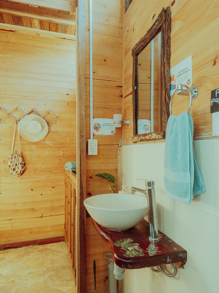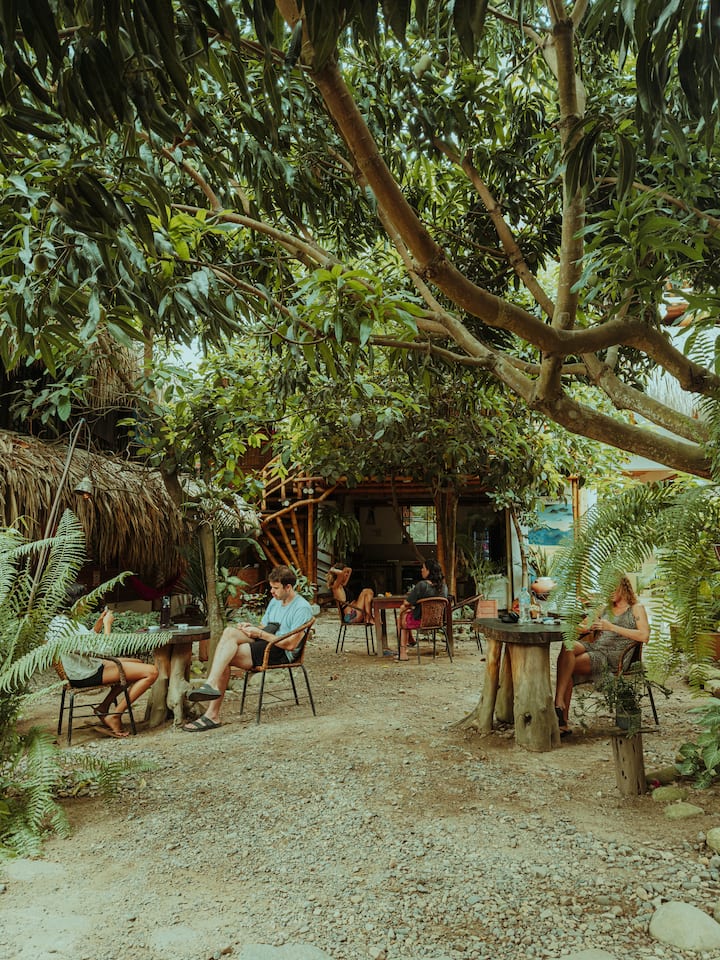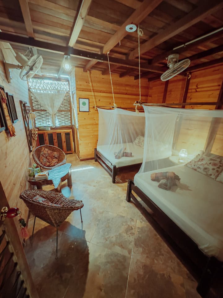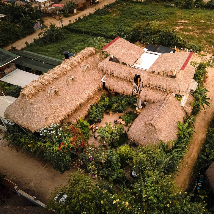 El hospedaje está construido en madera, bambú y hoja de palma, su diseño fue pensado para optimizar recursos como la brisa y la luz natural en pro del descando; y cada uno de los procesos y servicios se han resuelto para disminuir el impacto ambiental.