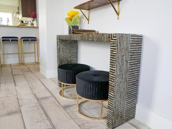 Este mini hotel boutique de 4 dormitorios/2 baños tendrá capacidad para hasta 10 personas por unidad durante tu escapada a Daytona Beach Escapade. Encontrarás una cama tamaño queen en el dormitorio principal (la habitación Santorini Retreat), dos juegos de literas individuales con 2 camas nido en la habitación de invitados 2 (The Gliding Away on the Sea Room), un futón de tamaño completo en la sala de estar (la sala de bares) y una ducha de pie junto al dormitorio principal. También se proporciona una lavadora/secadora privada.