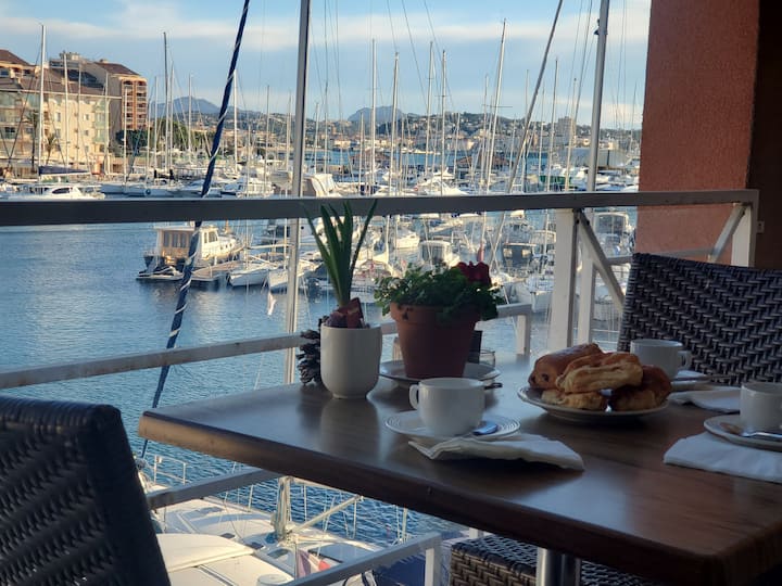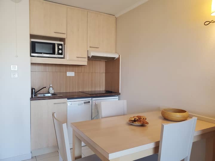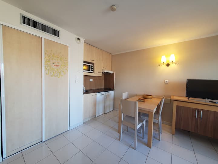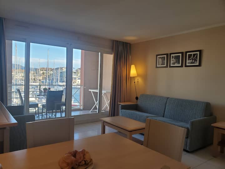 Estos 31m2 acomodarán muy fácilmente a 2/3 personas que disfrutarán de un hermoso balcón con una magnífica vista de Port Fréjus. La hermosa sala de estar con cocina abierta y equipada, un sofá y un sillón convertible en camas de 2 y 1 plazas, mesa y sillas que permiten tomar las comidas con vistas al gran ventanal, en otras palabras, una sensación de espacio hermoso.