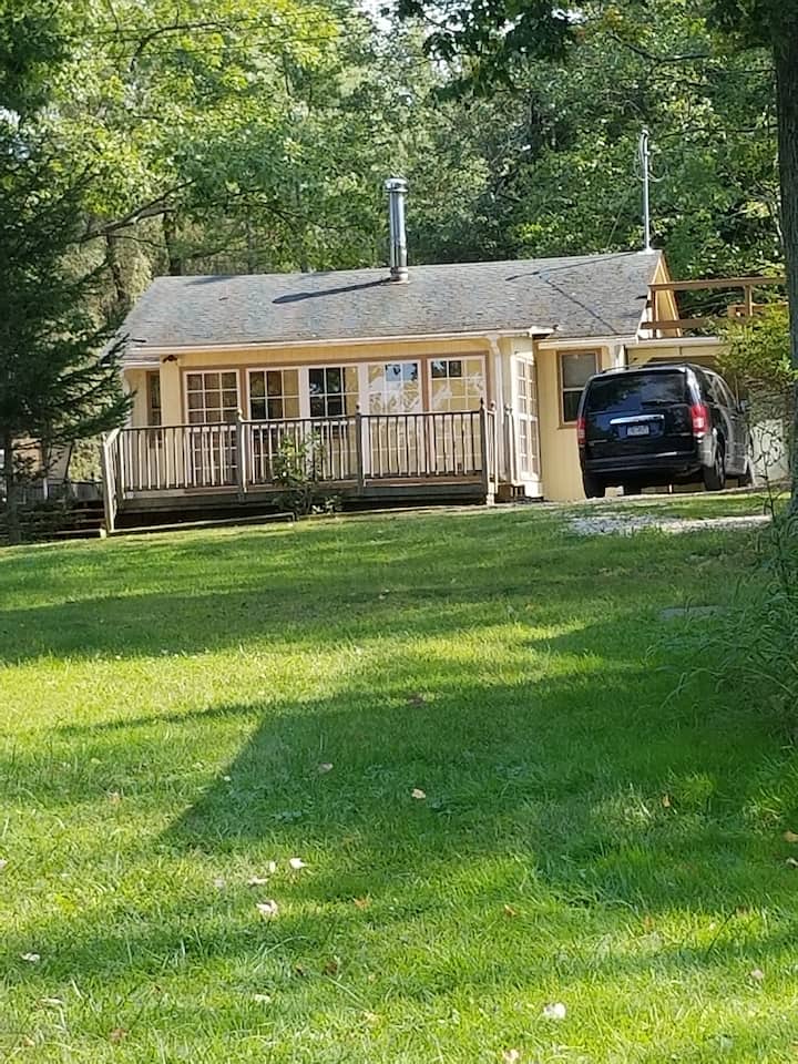 Acogedora cabaña amarilla junto al lago