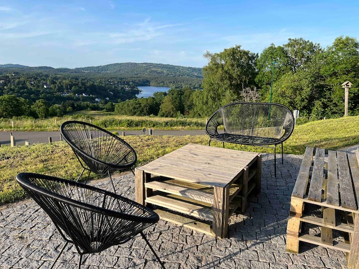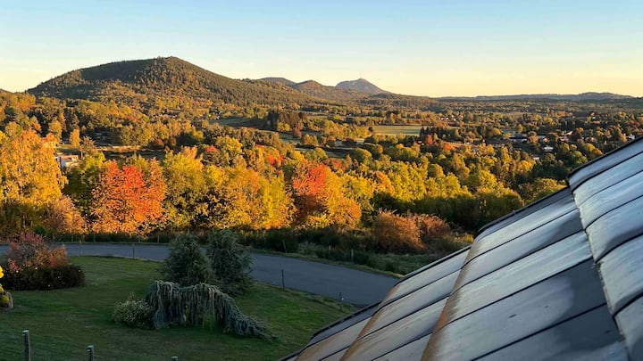 Maravilloso chalet de capullo, entre lagos y montañas, con vistas espectaculares y panorámicas del lago de Aydat, Puy-de-Dôme y todo el valle. Los grandes ventanales te ofrecerán el espectáculo permanente de la naturaleza cambiando con las estaciones. El lugar perfecto para venir y recargar las pilas en las montañas junto al lago para hacer un pícnic en primavera, para nadar en verano, para caminar en otoño y cerca de las estaciones de esquí por las alegrías de la nieve en invierno.