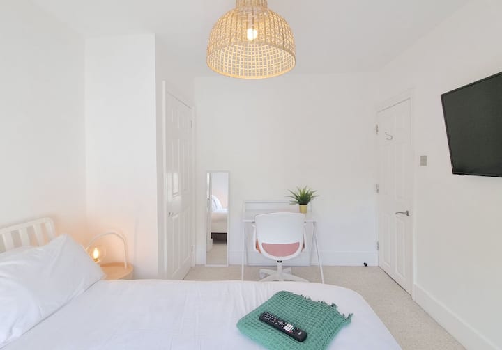 dormitorio 1: cama doble, televisor inteligente 4K de 43 pulgadas montado en la pared, escritorio plegable y silla de oficina
