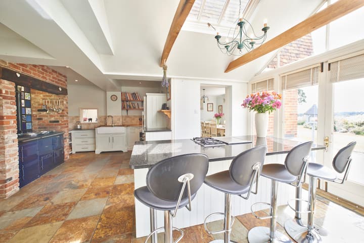 La cocina está en el centro de la casa y tiene un luminoso aspecto sur soleado con puertas dobles que se abren a la terraza que rodea la casa. Está muy bien equipado.