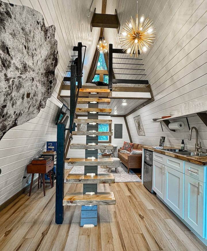 ¡Wolf Pup es una de las primeras casas de campo con árboles alpinos situadas en una colina en el bosque! Vuelve a conectar con la naturaleza que te rodea completamente, mientras contemplas la caída de 30 pies, en la cubierta trasera en esta escapada inolvidable. Es un acogedor estudio para 2 personas con una cocina pequeña y una pequeña sala de estar. ¡Sube los escalones del loft para encontrar una cama tamaño queen aislada con vistas increíbles! ¡El verdadero tesoro de esta cabaña se está sumergiendo completamente en el bosque, mientras disfrutas de la relajante red de hamacas!