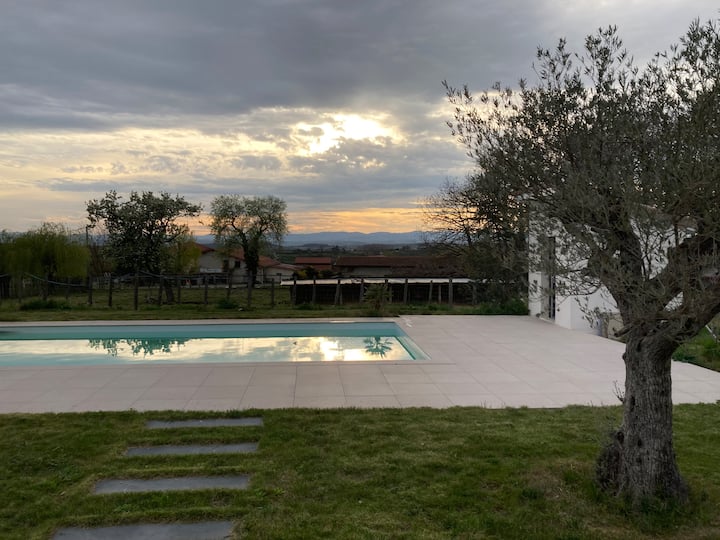 En el campo, no muy lejos de Vercors, nuestra propiedad es amplia e incluye 3 dormitorios, una oficina, una sala de estar con cocina, 2 hermosas terrazas y un gran jardín.