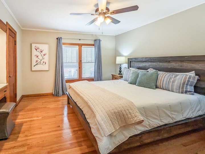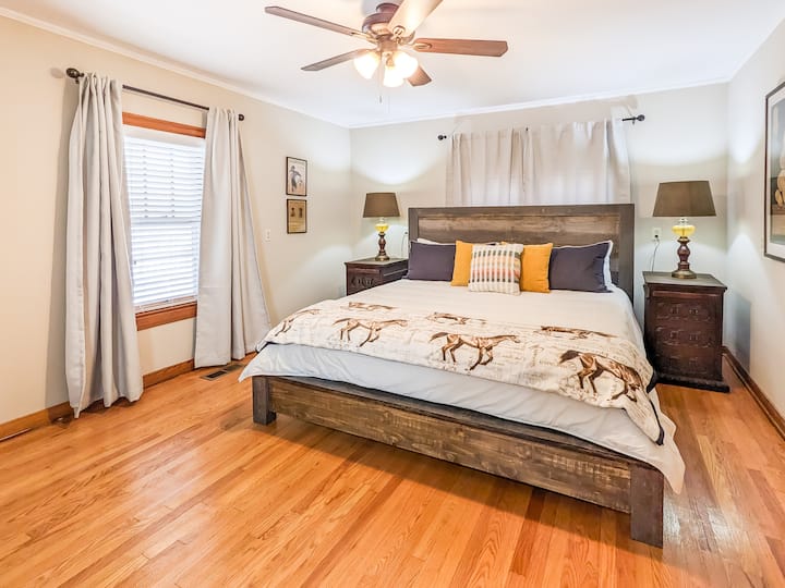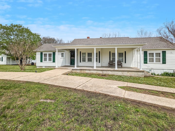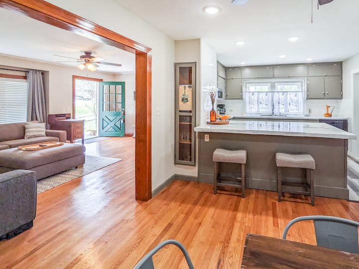 Casa familiar prominente y espaciosa en el centro de la ciudad a pocos pasos de la histórica plaza de la ciudad. Cuatro dormitorios distintos y tres baños completos. Puedes agregar la "Granny Cottage" de al lado para ampliar el tamaño de tu grupo y el espacio para respirar. La casa de estilo de mediados de siglo en Main ha sido recientemente renovada con muebles profundamente cálidos y cómodos + arte. Cuenta con una cocina moderna e inteligente y mejoras en el baño.