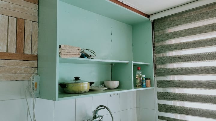 Artículos de cocina, microondas, cocina de gas (mini estufa),refrigerador,platos, olla de agua electrónica,