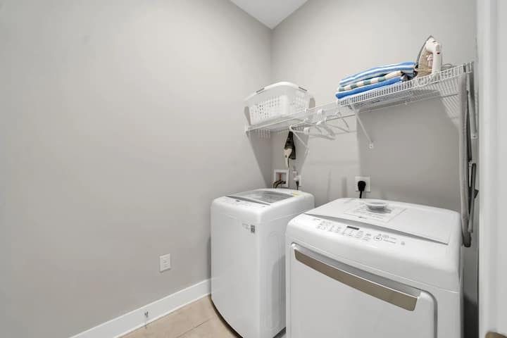 La lavandería está abajo y ofrece lavadora y secadora, así como un juego de toallas de playa para tu uso. También contamos con un calentador de agua caliente sin tanque, ¡así que trae a toda la familia y nunca te preocupes por quedarte sin agua caliente o turnarte para ducharte mientras estás de vacaciones!