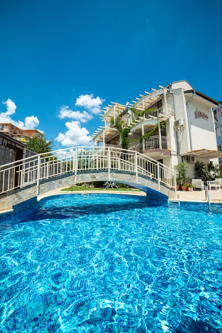 El complejo se encuentra en una zona famosa por su aire antiionizado, un raro fenómeno natural llamado «Karel» que combina las corrientes marinas y montañosas. Tiene efectos terapéuticos para el sistema musculoesquelético, la piel, las alergias y las enfermedades del sistema respiratorio, por lo que es un lugar ideal para quienes buscan unas vacaciones saludables y relajantes. El complejo también cuenta con una piscina al aire libre de temporada y un jardín, perfecto para esos calurosos días de verano. También hay una parada de autobús justo delante del complejo, lo que hace que sea muy fácil para nuestros huéspedes visitar los centros turísticos cercanos: Nessebar, St Vlas, etc.