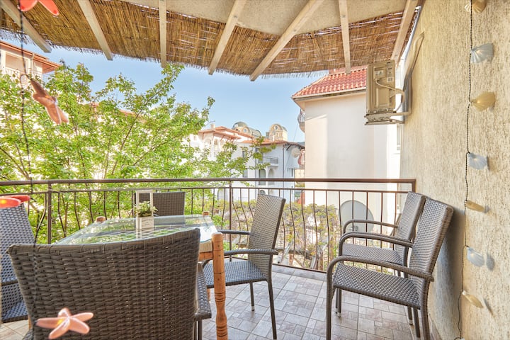 Bienvenido a nuestro acogedor apartamento de cuento de hadas marítimo ubicado entre Sveti Vlas y Sunny Beach, Bulgaria. El apartamento está situado en un hermoso complejo cerrado a solo 5 minutos a pie de la playa más bonita, tranquila y mejor mantenida, lo que lo convierte en el lugar perfecto para unas vacaciones familiares.