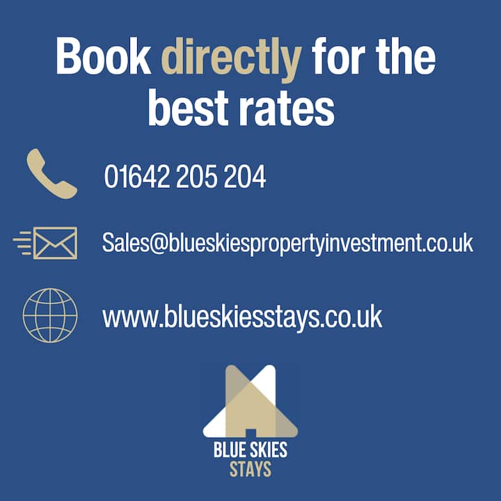 Blue Skies Stays: somos un proveedor de alojamiento de servicio completo para estancias cortas que ofrece propiedades bellamente amuebladas y bien ubicadas en todo el noreste tanto para trabajar como para divertirse. ¿En qué podemos ayudarte?