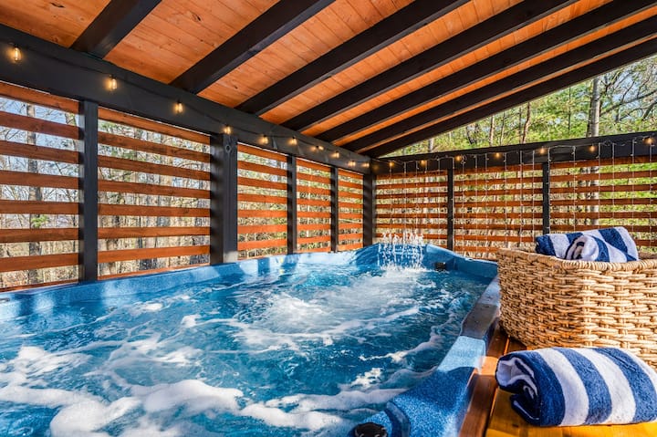 Windsong Retreat es realmente una escapada a la montaña única en el lado tranquilo de los Smokies. Experimentarás el único jardín zen en las montañas Smoky. Imagina tener una piscina y un spa terapéutico TODO EN UNO, en la privacidad de tu pérgola hecha a medida. Esta lujosa cabaña de madera es extremadamente privada con 3 dormitorios: 2 dormitorios en el nivel principal más un loft del dormitorio principal. La cocina digna de un chef incluye varios electrodomésticos de alta gama. Enormes paredes de cristal correderas. Situado justo sobre la frontera de Wears Valley/Townsend TN. El 5 % de descuento se aplicará automáticamente al reservar.