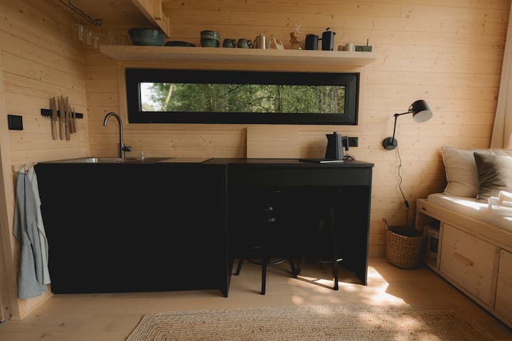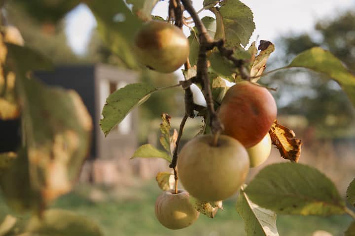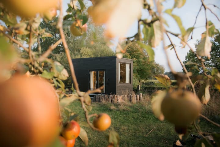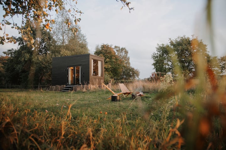 Minicasa con vistas a un prado de vacas