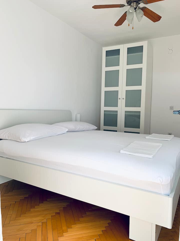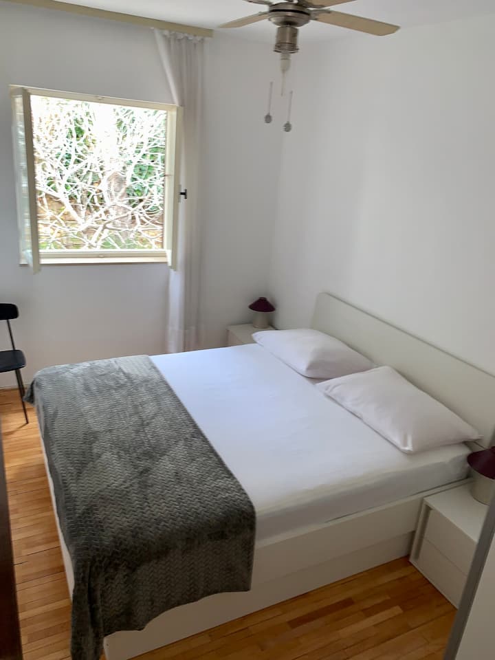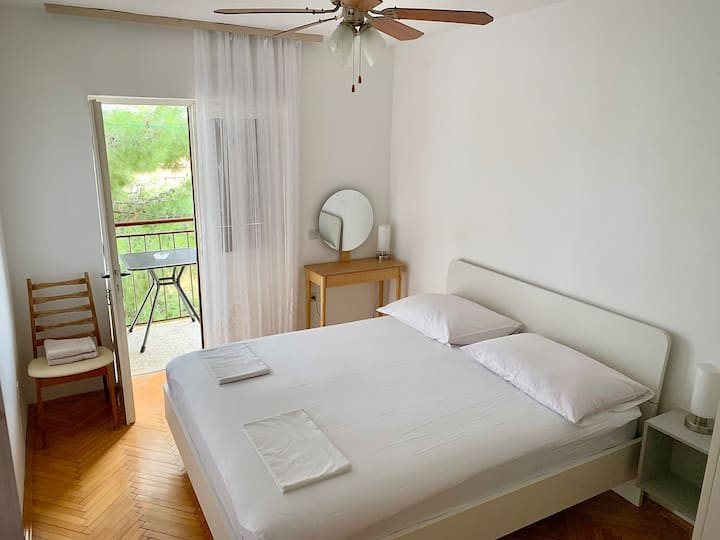 • Habitación 2: sin balcón, aire acondicionado, ventilador de techo, suelos de madera, vistas al jardín y a la montaña (Omiška Dinara).