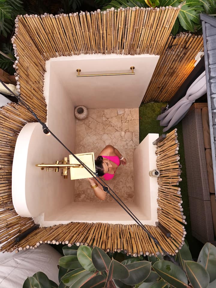 Relájate con una ducha exterior y un jacuzzi.
