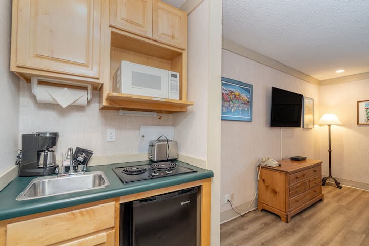 Esta cocina pequeña te ofrece una placa de cocina de dos quemadores, mininevera, microondas, tostadora, cafetera y las sartenes y platos que necesitas para completar cualquier comida. La cama se puede hacer como una cama tamaño king o dos camas individuales. El baño tiene un gran área de tocador exterior y una ducha escalonada.