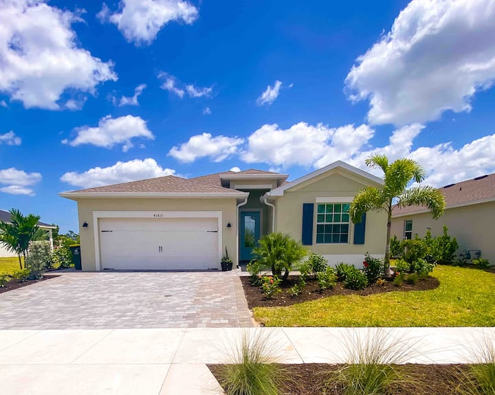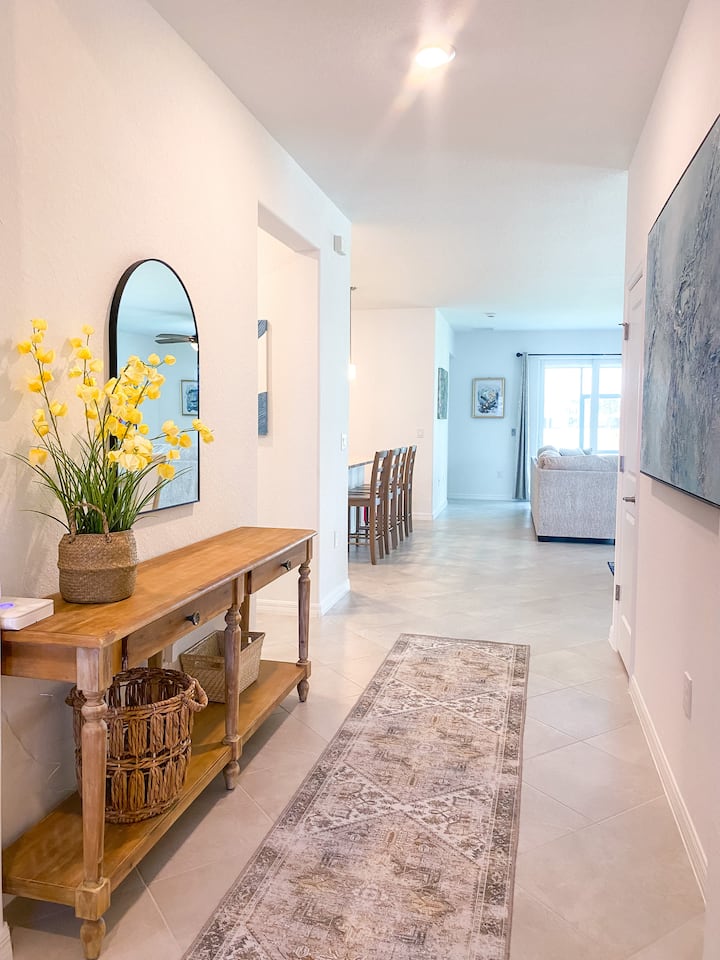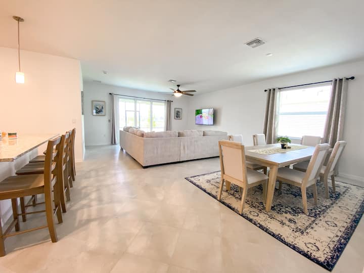 Esta casa de nueva construcción de concepto abierto abarca 2600 pies cuadrados y cuenta con 4 dormitorios y 3 baños. Ofrece muebles completamente nuevos y comodidades modernas, como una lavadora y secadora en la unidad, una cómoda sala de estar con TV (la TV requiere que los huéspedes inicien sesión en sus propias suscripciones de servicios de streaming como Netflix, Hulu o YouTube TV), un comedor perfecto para comidas familiares, un espacio de oficina para el trabajador remoto, wifi y un porche lanai al aire libre. Además, incluye una plaza de aparcamiento en el garaje, artículos generales de cocina, cafetera, enfriador de vino, libros, juegos, toallas de piscina y artículos esenciales para el hogar.