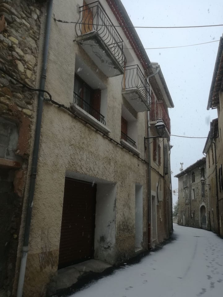 Consta de una habitación principal con Clic Clac y una cocina separada, un baño y un inodoro en el primer piso de una casa de pueblo.