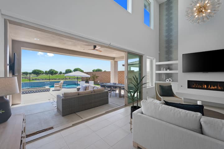 La sala de estar se abre a tu propio paraíso privado en el desierto al aire libre con algo para todo el grupo, ¿mencioné las puertas apilables? El patio trasero bellamente ajardinado cuenta con una mesa de comedor al aire libre, zona de estar con sofá y TV al aire libre de 65 pulgadas, chimenea con asientos, barbacoa de gas incorporada, putting green, mesa de ping pong y mucho más.