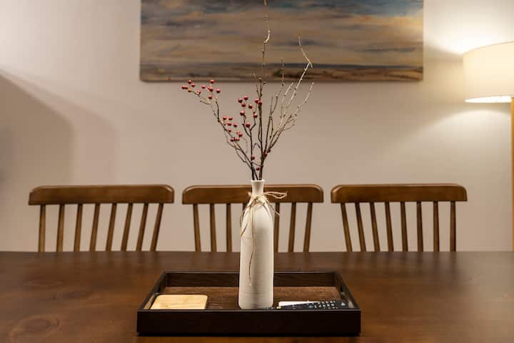 - La sala de estar tiene una mesa de comedor donde 8 personas pueden hablar y comer cómodamente.