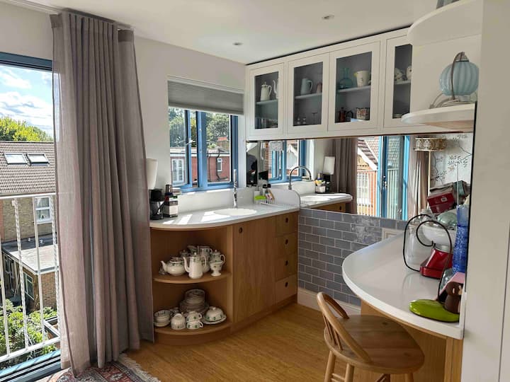 Encantador estudio en un segundo piso en una casa familiar feliz