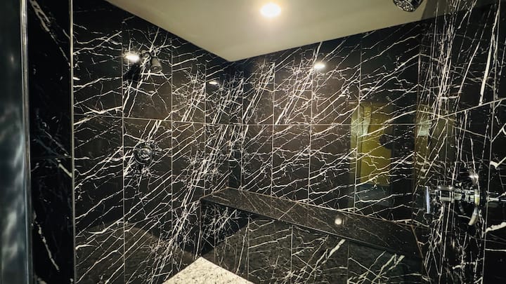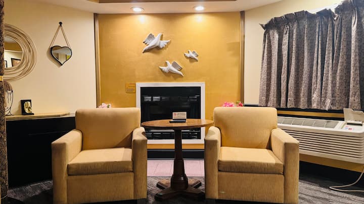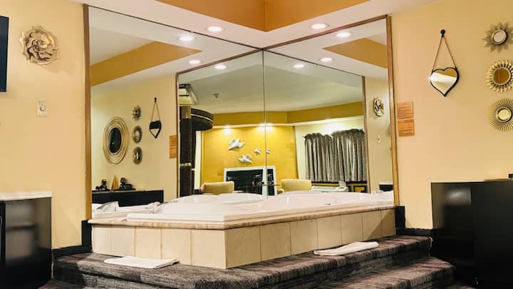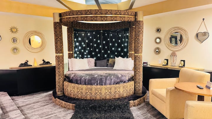 Suite temática en negro y dorado con jacuzzi y chimenea