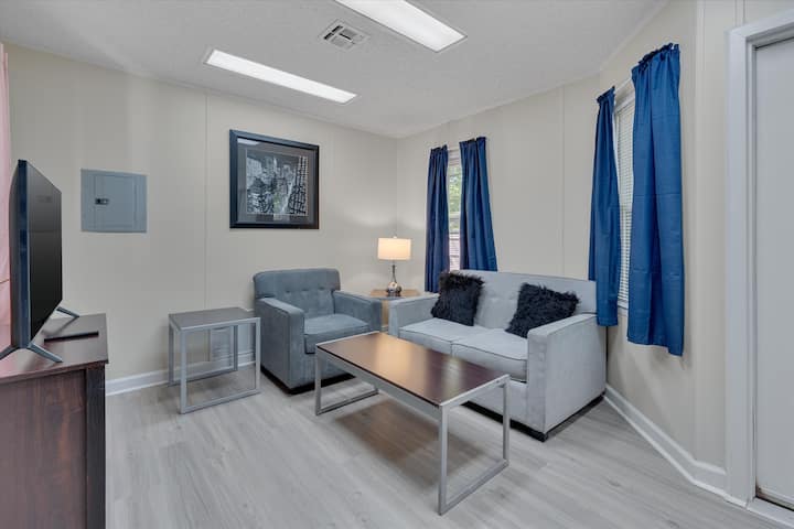 Esta casa de un dormitorio con valla completamente cerrada en una hermosa propiedad privada. Perfecto para huéspedes con perros que necesitan entrada a cero escalones. Toda la unidad ha sido completamente renovada, el baño tiene barandillas para discapacitados, convenientemente ubicados cerca del hospital Duke, la universidad Duke, Research Triangle Park (RTP) y el centro de Durham.