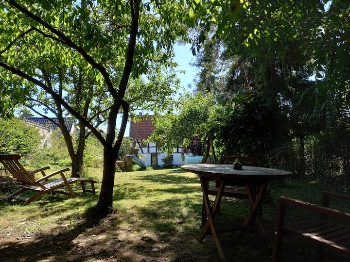 Acogedora casa de entramado de madera con un gran jardín