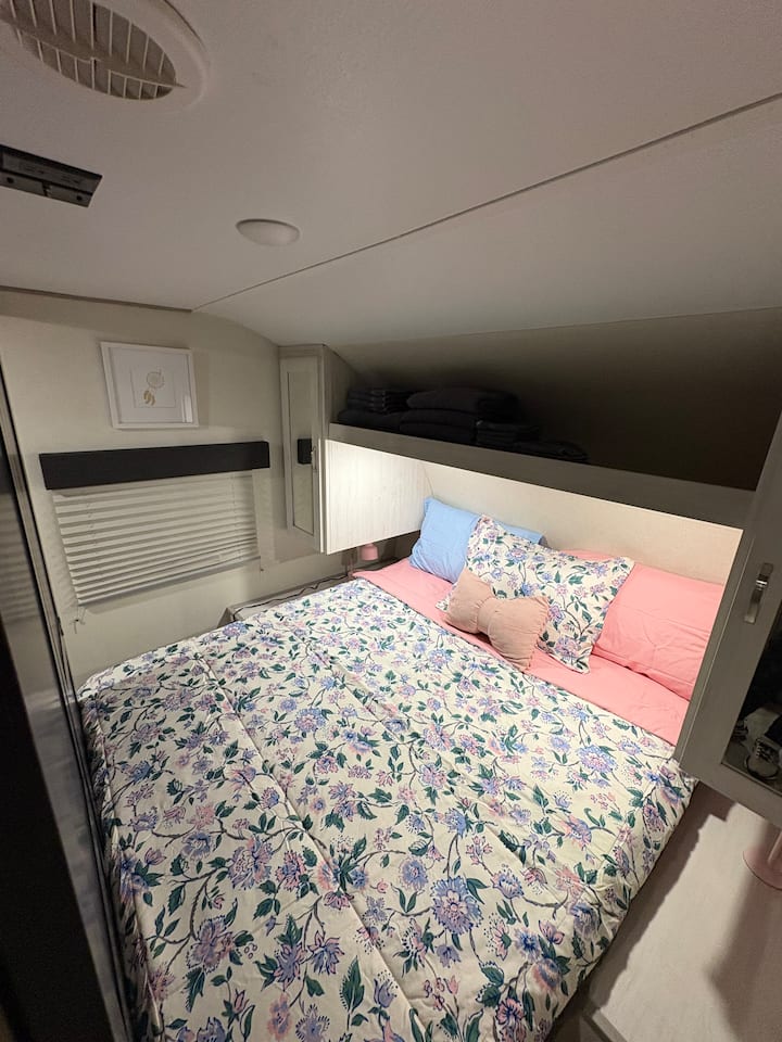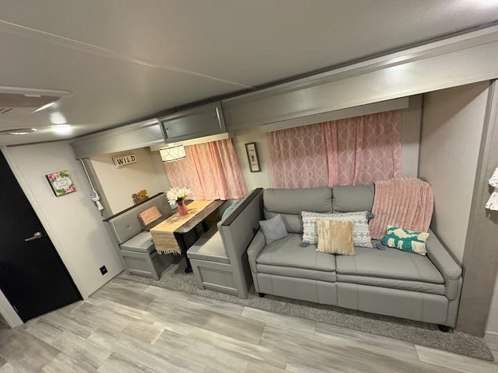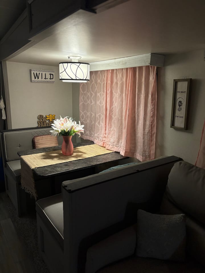 Acogedora casa rodante rosa boho cerca de OU y el lago