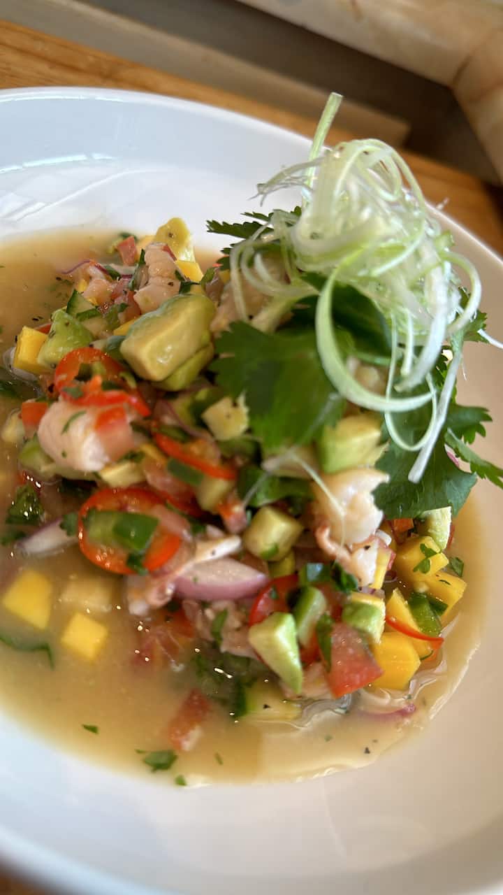 Este delicioso aperitivo incluye carne de langosta fresca, aguacate, mango, jalapeño, chile Fresno, cebolla roja, pepino, cilantro y zumo de lima recién exprimido