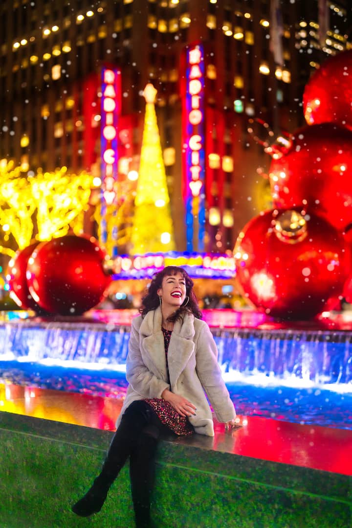 Envuelto en el resplandor de la temporada, esta sesión de fotos de 30 minutos captura los icónicos adornos rojos que brillan frente al Radio City Music Hall. Los reflejos bailan en la superficie de la fuente, mezclando el brillo de la ciudad con la calidez de las vacaciones. Un momento atemporal en Nueva York donde la magia, las luces y la risa se encuentran en la Sexta Avenida. Todas las fotos sin editar están incluidas y las fotos editadas se pueden comprar por $25 cada una.